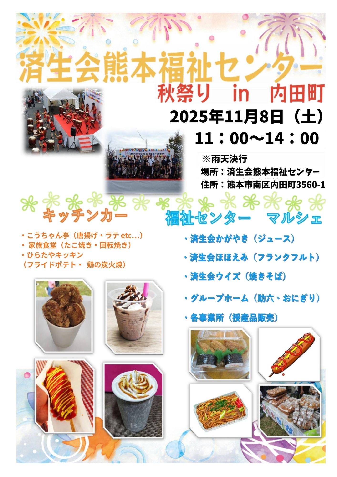 「済生会熊本福祉センター秋祭り inうちだまち」を開催いたします。 利用者さんやご家族はじめ地域の方々に楽しんでいただきたく、今年も様々なイベントを企画しております。 キッチンカーによる食バザーやステージイベントなどがありますので、皆様お誘いあわせの上、ご来場ください!