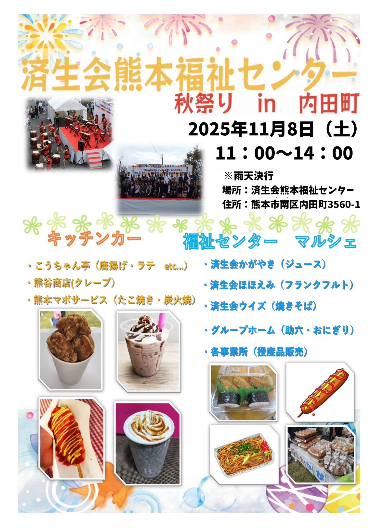 「済生会熊本福祉センター秋祭り inうちだまち」を開催いたします。 利用者さんやご家族はじめ地域の方々に楽しんでいただきたく、今年も様々なイベントを企画しております。 キッチンカーによる食バザーやステージイベントなどがありますので、皆様お誘いあわせの上、ご来場ください!
