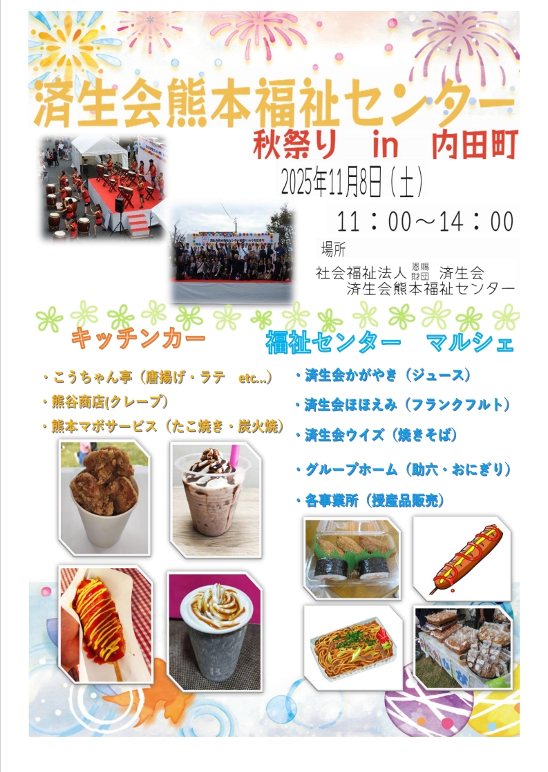10時~15時のボランティア活動を終え、参加した人たちからは「色んな人たちと関われて楽しかった。」「高齢者の人と喋るときに緊張した。」「また来年も行きたい。」などの声が聞かれました♪ これから、ウイズでも地域の方との関わりや利用者さんたちが様々な職種をしることの出来る機会を増やせていければと思います! 2025.11.8(土曜)には済生会熊本福祉センターでも秋祭りを開催いたします♪ 一般の方も来場が可能ですので、皆様ぜひ『済生会熊本福祉センター秋祭り』にお越しください☆ミ