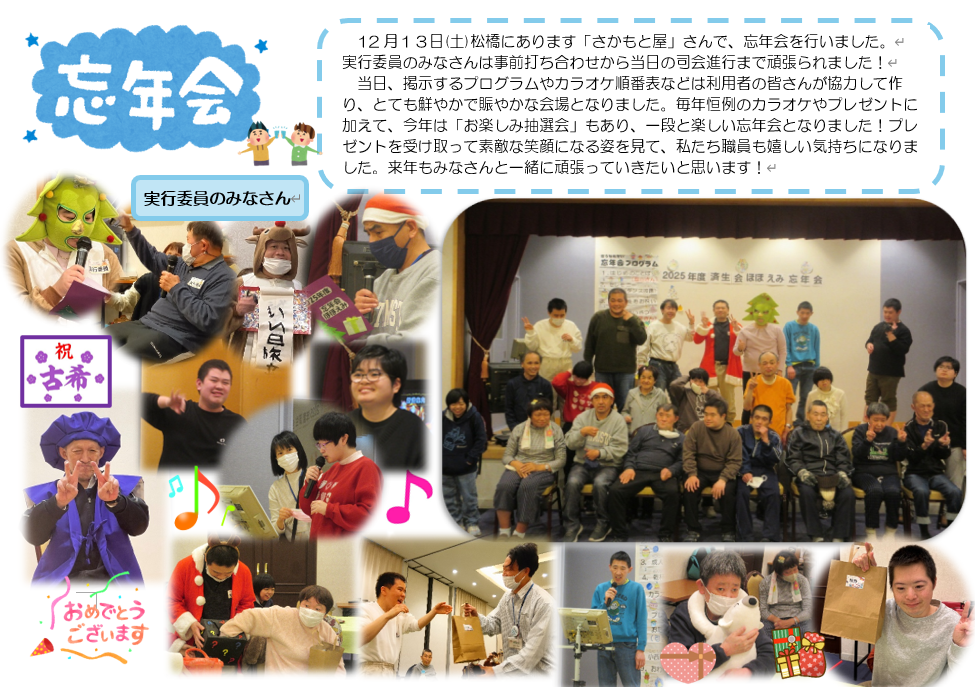ほほえみ通信12月号が完成しました(^^)/ 生活介護は“昼食買い物”、B型は“大掃除”の様子を掲載しております。 また、今回は生活介護、B型の合同で行った“忘年会”の様子を増刊号で掲載しております☆ ぜひ、ご覧ください(^^♪