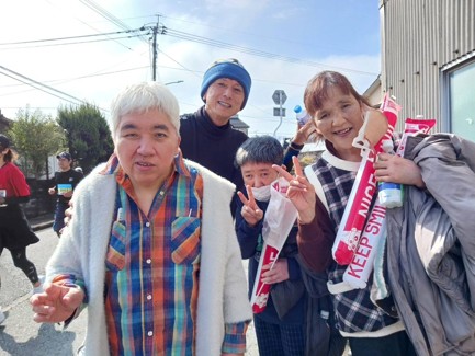 走っている支援員さんを見つけてびっくり。みんなで記念撮影をしました。