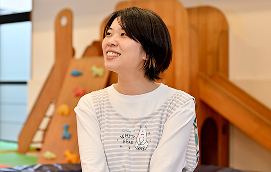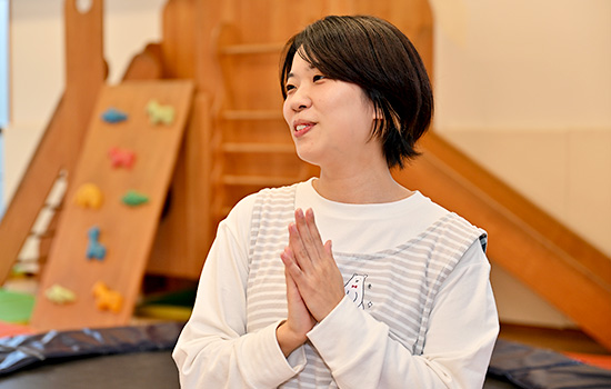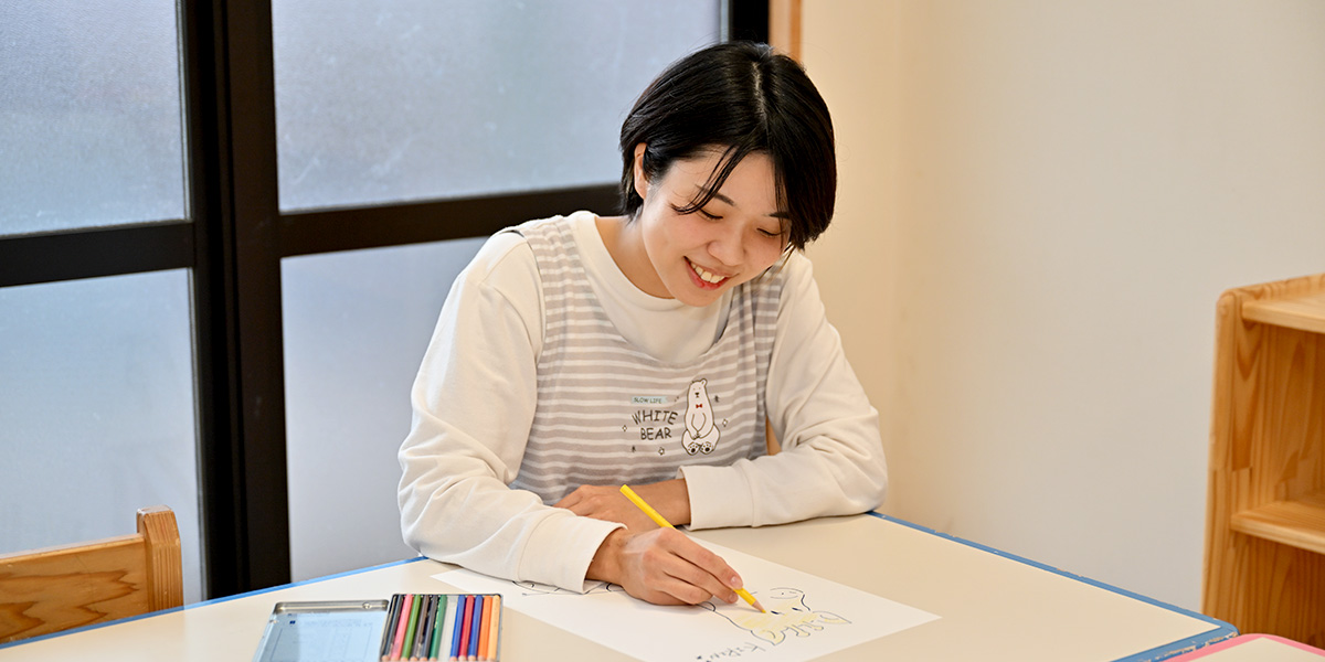 在籍していた大学の求人サイトで見て初めて児童発達支援センターの存在を知り、子どもにかかわる仕事に興味があった私は見学を申し込みました。施設内の朗らかな雰囲気、子どもと目線を合わせ真摯にかかわる先生方の姿、そして何より、安心できる時間を守られた子どもたちの楽しそうな姿が印象的で、ここで一緒に子どもとそのご家族のこれからを支えていきたいと思い、福祉センターを選びました。