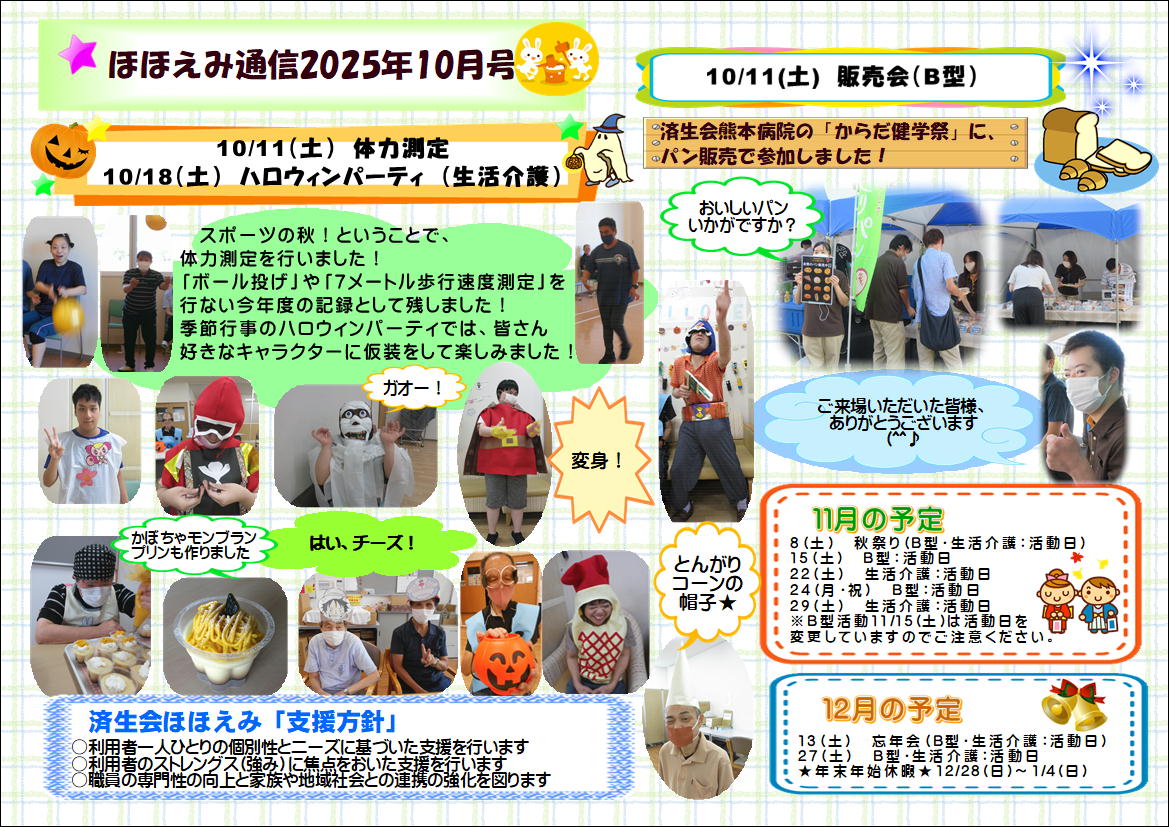 ほほえみ通信10月号では、生活介護で開催した「ハロウィンパーティー」やB型で参加したパンの販売会「からだ建学祭」の様子を掲載しております。