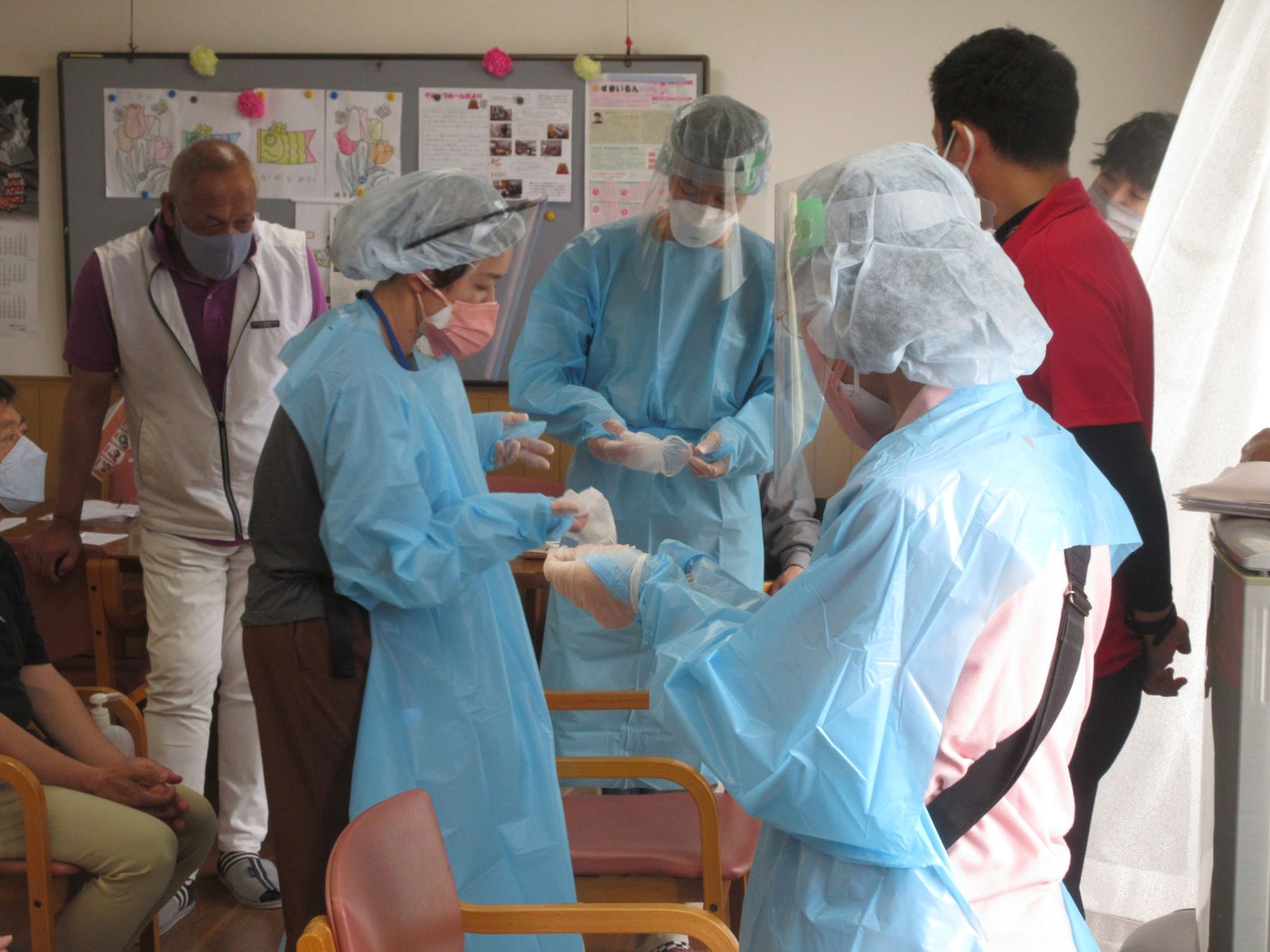 5月12日、職員を対象に新型コロナウイルス感染症が発生した際に必要な「マスク・ガウン・ゴーグル・フェイスシールド・手袋」の装着・脱着の仕方や、正しい手指消毒・手洗いの方法等の実践研修を看護師の指導のもと行いました。