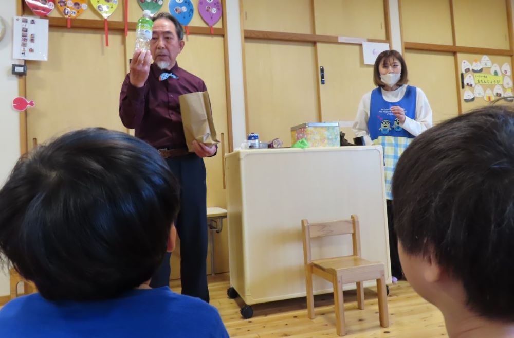 また、手品の時間もありました☆ 次から次に出てくる・・・。子どもたちだけでなく、職員も「ええーーー!」とついつい大興奮。見ている側は“どうなってるの?”と自力で種を明かしたい気持ちになる、面白く楽しい時間でした。終わったあとも、印象に残った手品を一生懸命真似て「ほら!」と職員やお母さんに披露しているお友だちもいました。 なでしこ園と地域との交流を兼ねた時間。子どもたちも、地域の方と過ごすことに慣れてきて「また来てくれるかなあ」と期待しています。また一緒に遊ぼうね