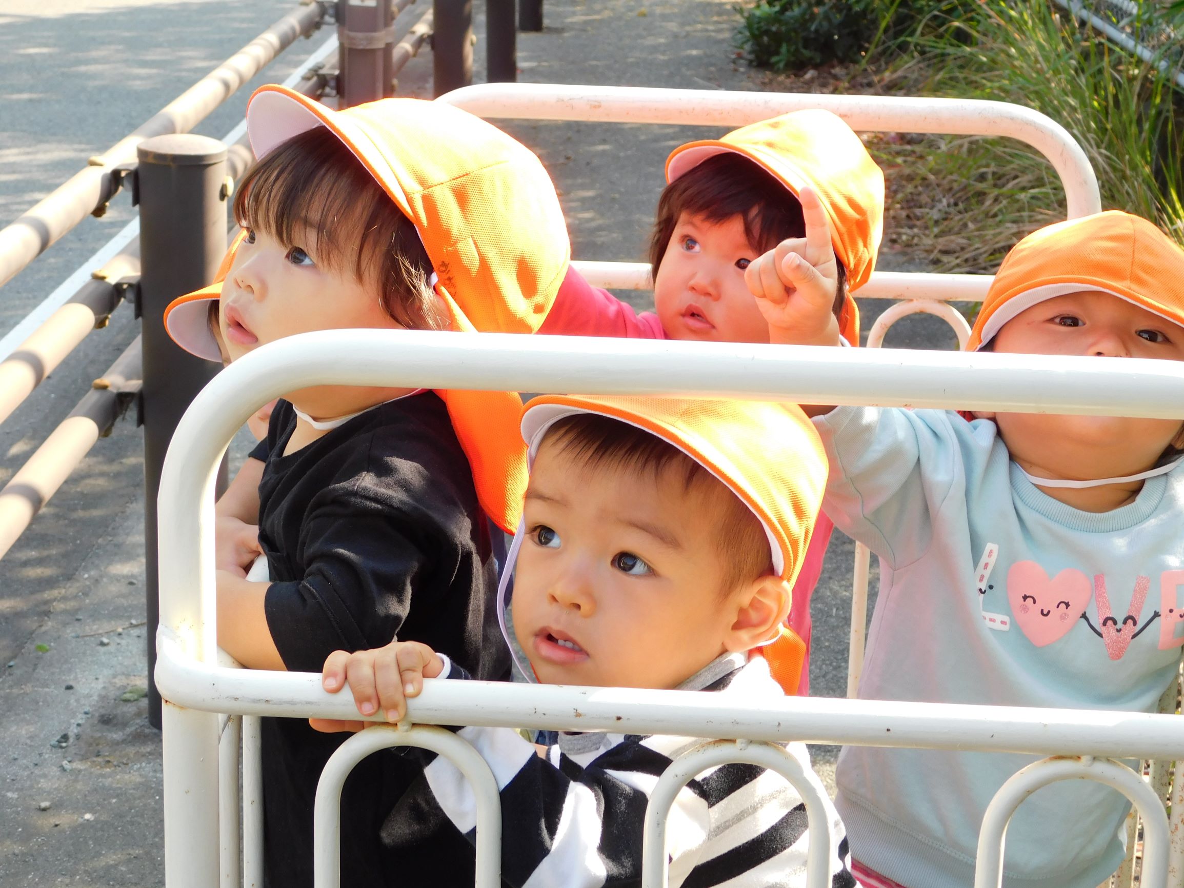 線路の近くまで歩いて行くと、ガタンゴトンと音がして目の前を電車が通ると、「あ~!」っと声を上げて手を振るお友だちでした。 また、飛行機が良く見えたので「見て!飛行機だよ。」と声を掛けてみると…