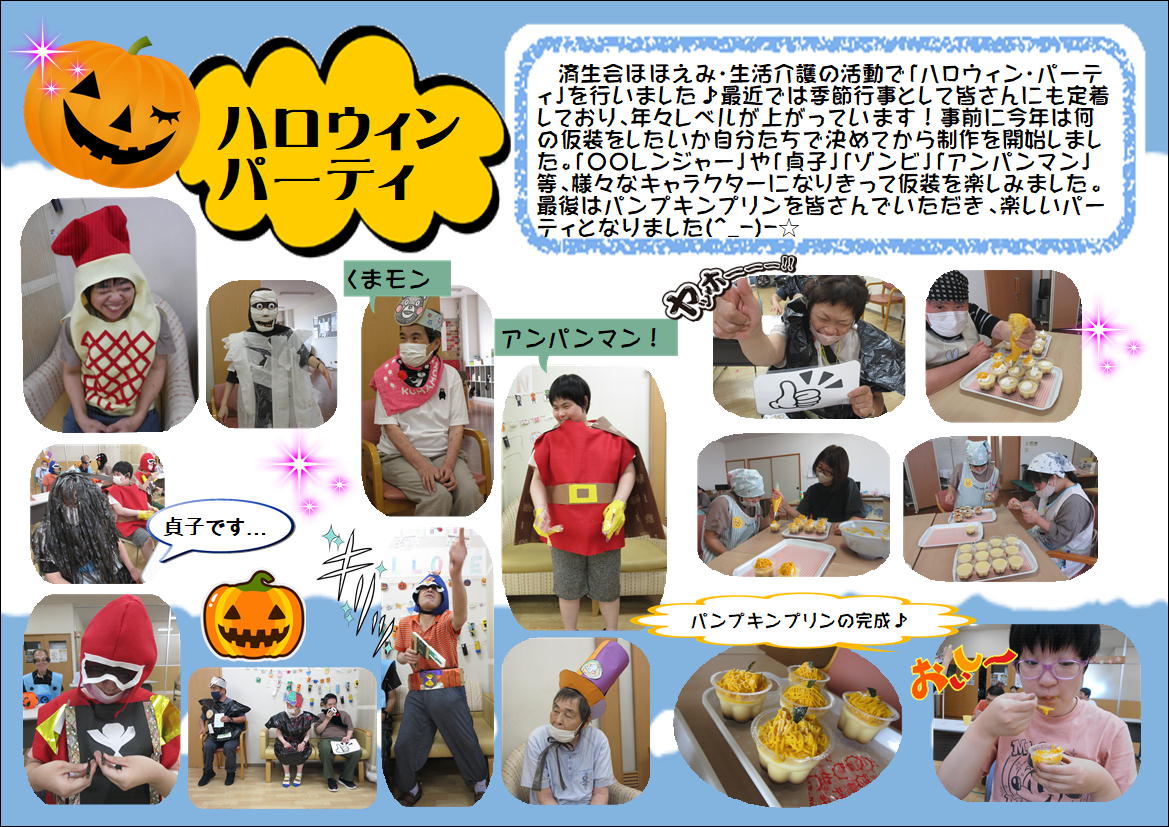済生会ほほえみ・生活介護の活動でハロウィンパーティを行いました!今やすっかり秋の風物詩となり、思い思いのキャラクターになりきり仮装を楽しみました。「トリック・オア・トリート!(お菓子をくれなきゃ、いたずらするぞ!)」の声掛けで「パンプキンプリン」をゲット!みんなで美味しくいただきました(^_-)-☆