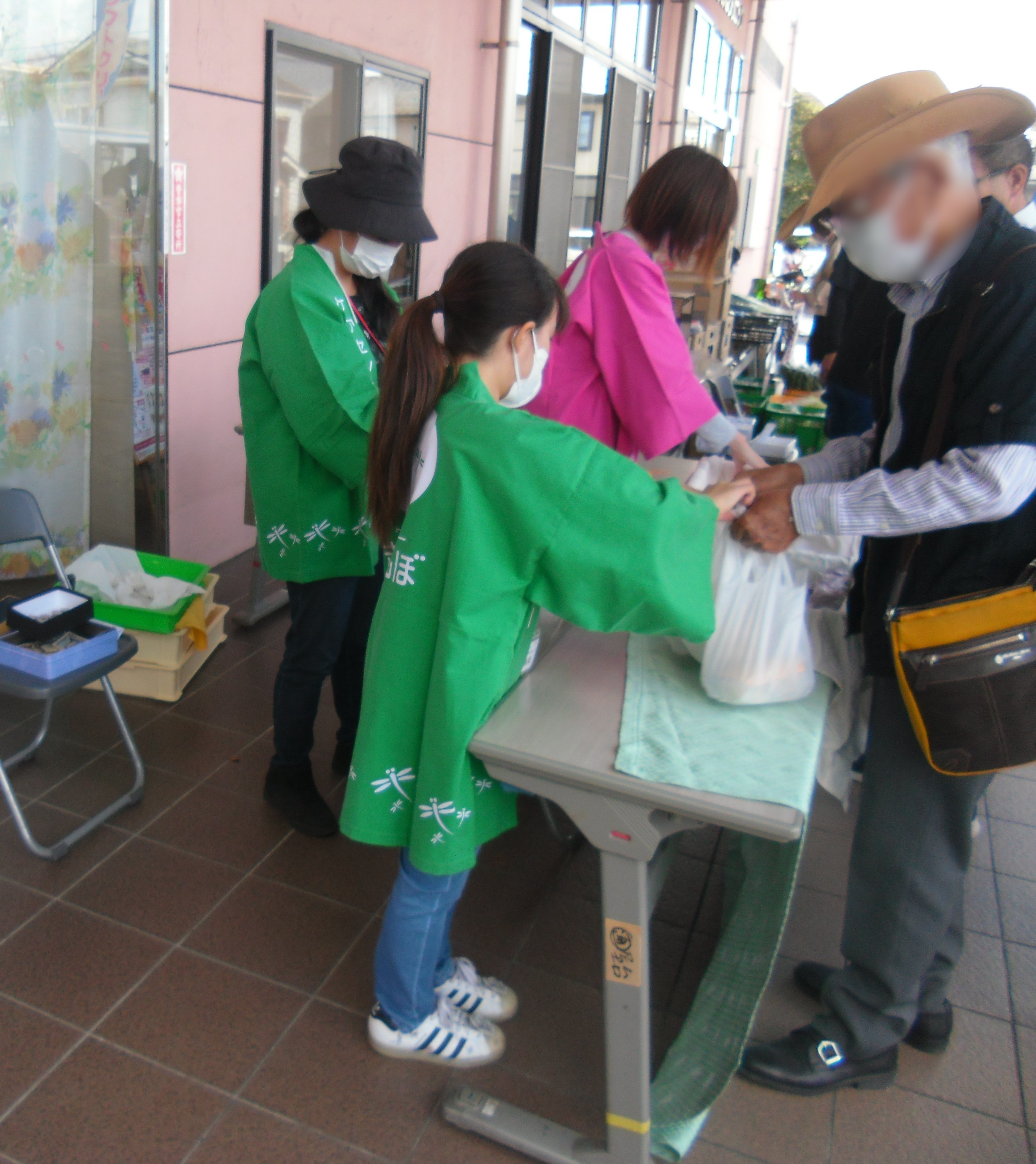 女性2名はいきなり団子の販売を担当させていただき、男性3名は環境整備(屋台の机の後片付けなど)を担当させていただきました。 いきなり団子の販売は一度に10個、20個と注文されるお客様もおられ、施設職員の方の協力も得ながら無事対応することが出来ていました。 環境整備を担当した男性陣は、初めのうちは緊張していましたが、徐々に慣れていき「今のうちにゴミをまとめてきます。」「燃えるごみの中にペットボトルがあったので分けておきました。」と積極的に行動されていました。