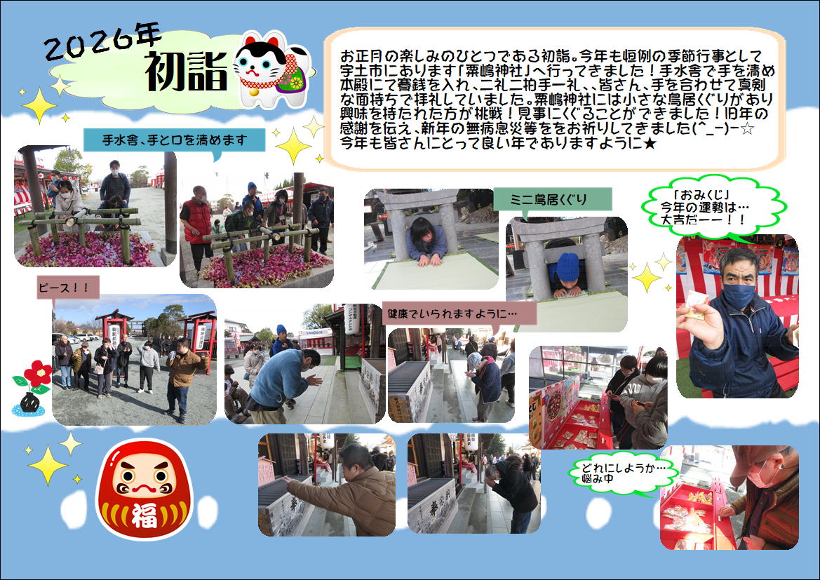 1月10日に宇土市にあります「粟島神社」へ初詣に行ってきました!当日は朝から雨模様でしたが、出発する頃には晴れ間があり無事に行くことができました。年に一度の神社参り、身も心も引き締まります。今年も皆さんにとって良い一年でありますように(^_-)-☆