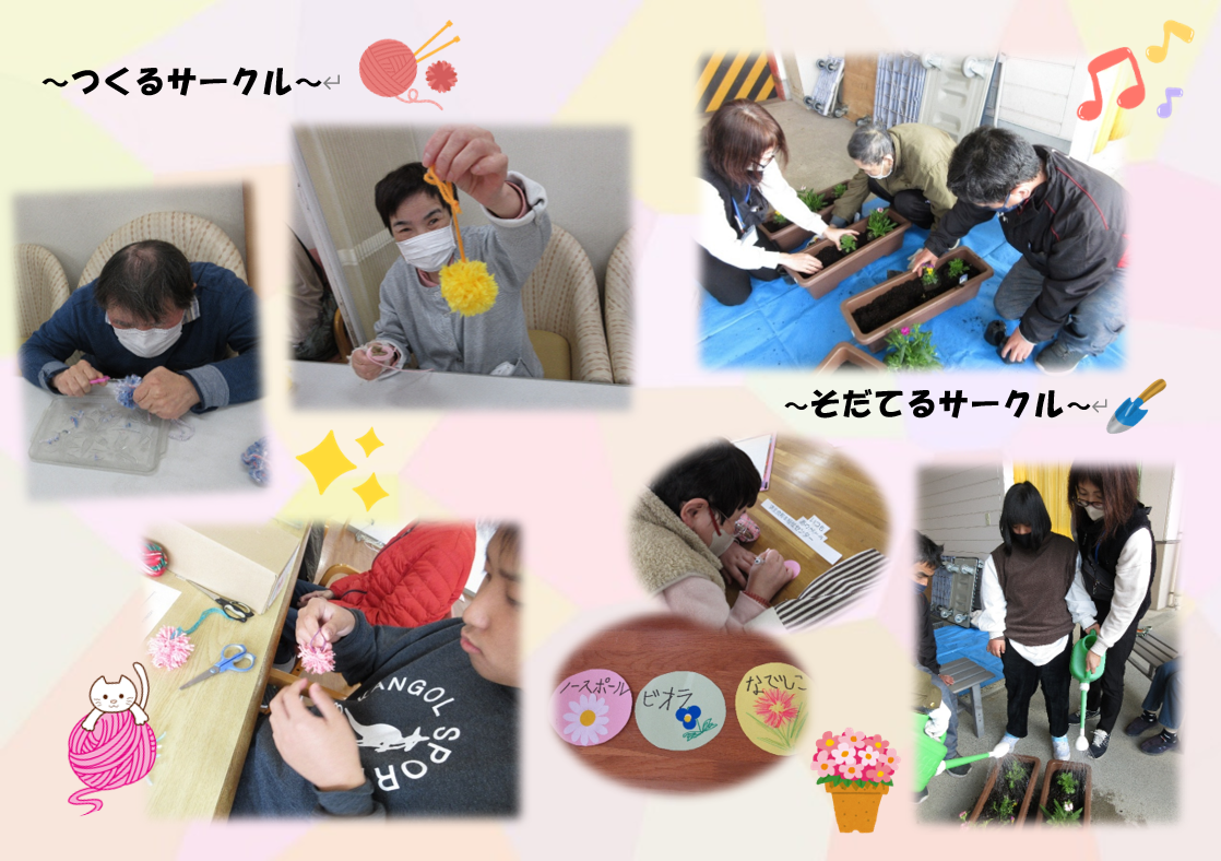 「つくるサークル」では、毛糸を使ってボンボン作りをしました♪ 好きな色を選んで、毛糸をぐるぐる巻いたり、ハサミで形を整えたり… お気に入りのボンボンキーホルダーが完成しました(^^)/ 「そだてるサークル」では、花の苗植えをしました♪ プランターの土に3種類の花の苗を植えて、最後は水やりしました! 春には綺麗な花が咲くといいなぁ…(*´▽`*)